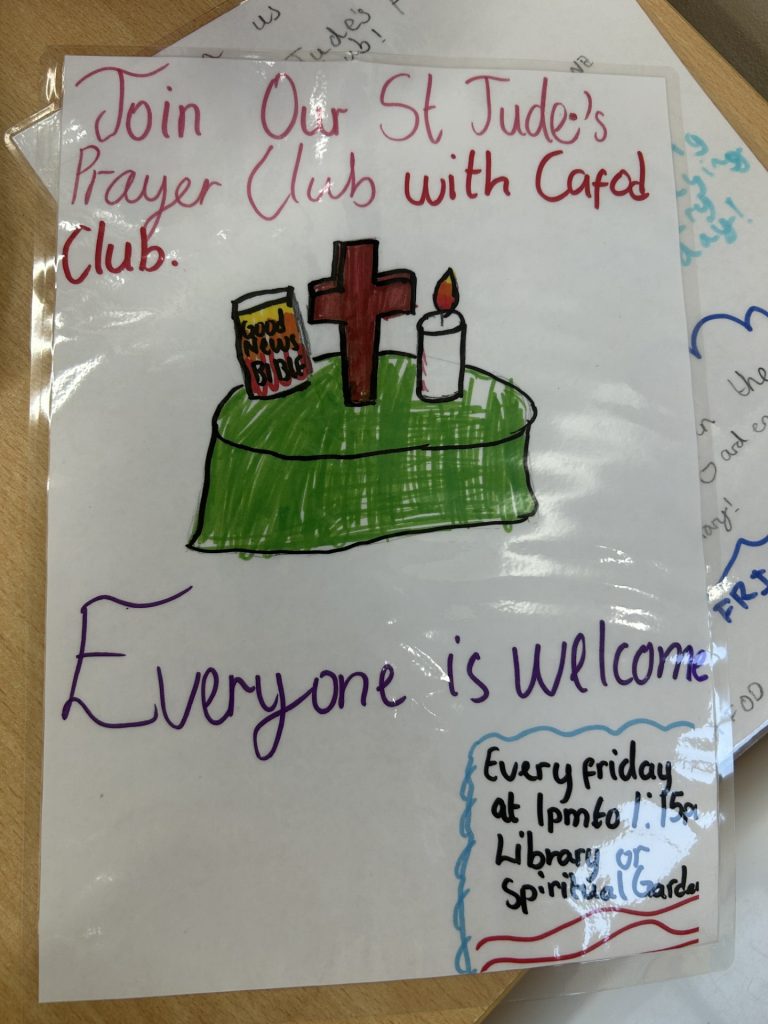 Our CAFOD Club have created a ‘Prayer Club’ which will take place every Friday at 1pm in our school library or our Spiritual Garden. Our prayer club is about speaking your mind and participating in all activities. After all, one of the main CST (Catholic Social Teaching) principles is ‘Call to Family, Community and Participation’. Our school’s prayer club is a very friendly place to be in, where we pray, love and there is always a spot open. We are always ready to welcome you! Our prayer club helps us follow our school motto by reminding us to follow Jesus’ footsteps and how He would want us to act. We learn, love and grow in the footsteps of Jesus. Watch this space to find out what we get up to!