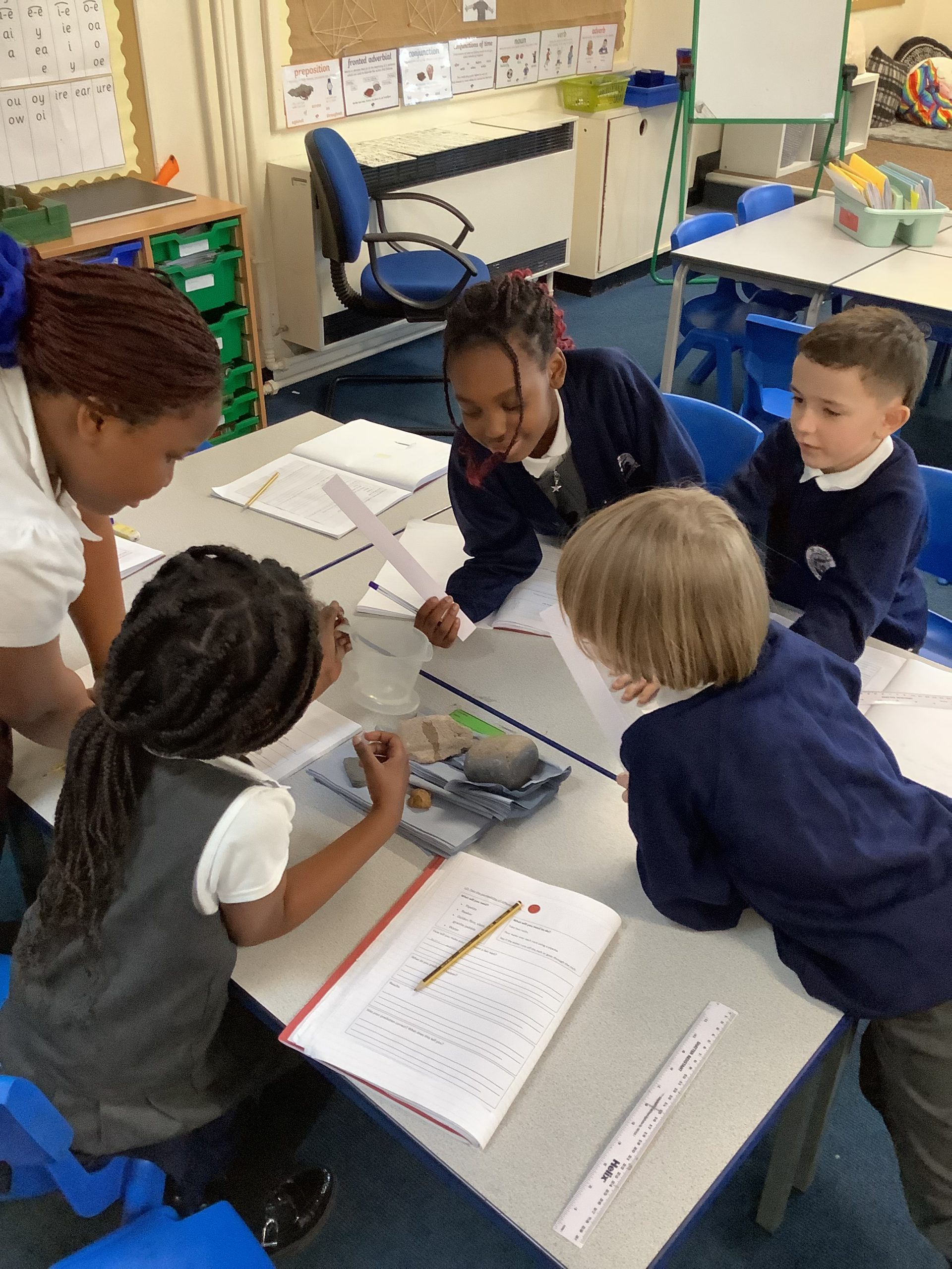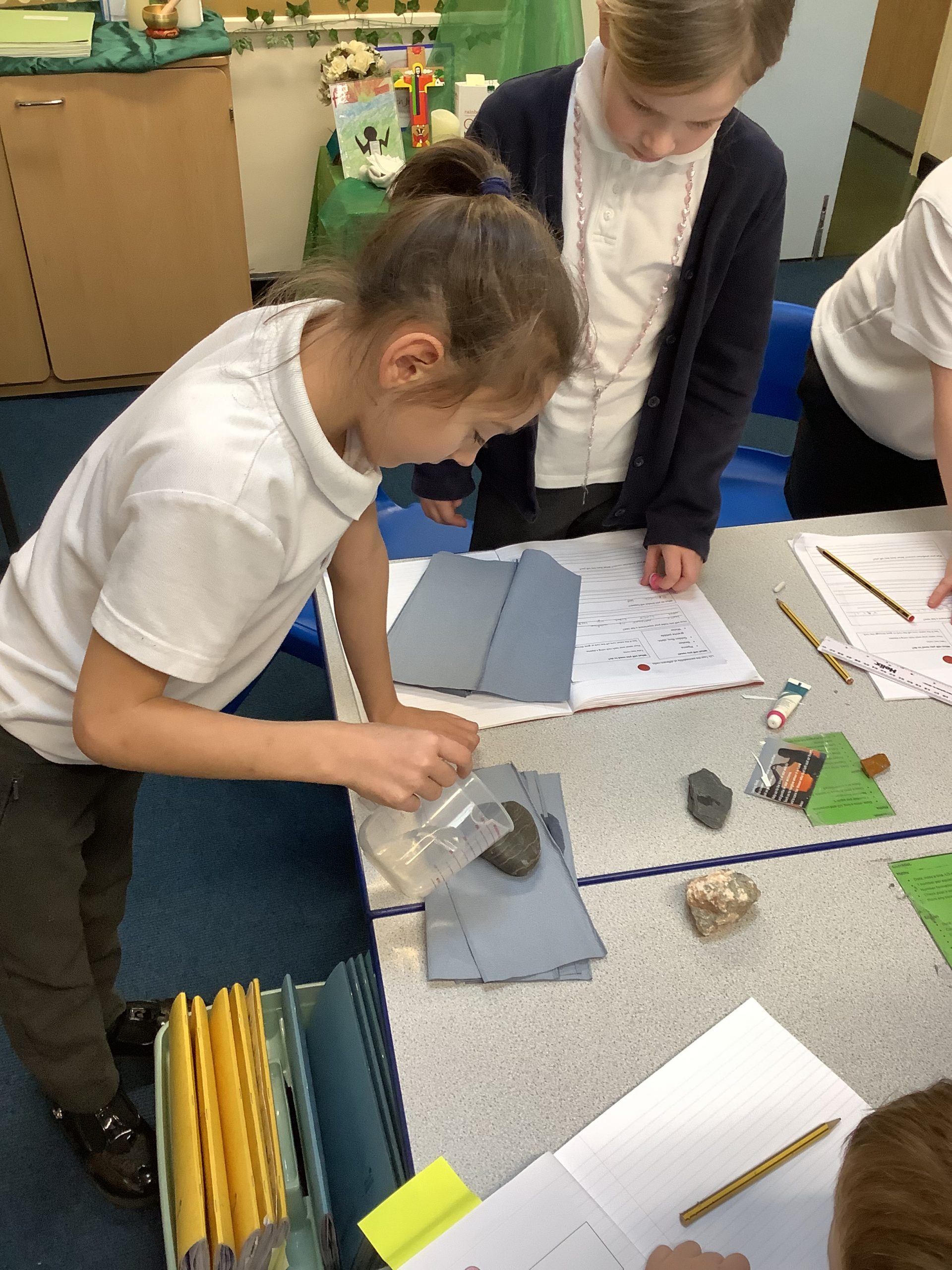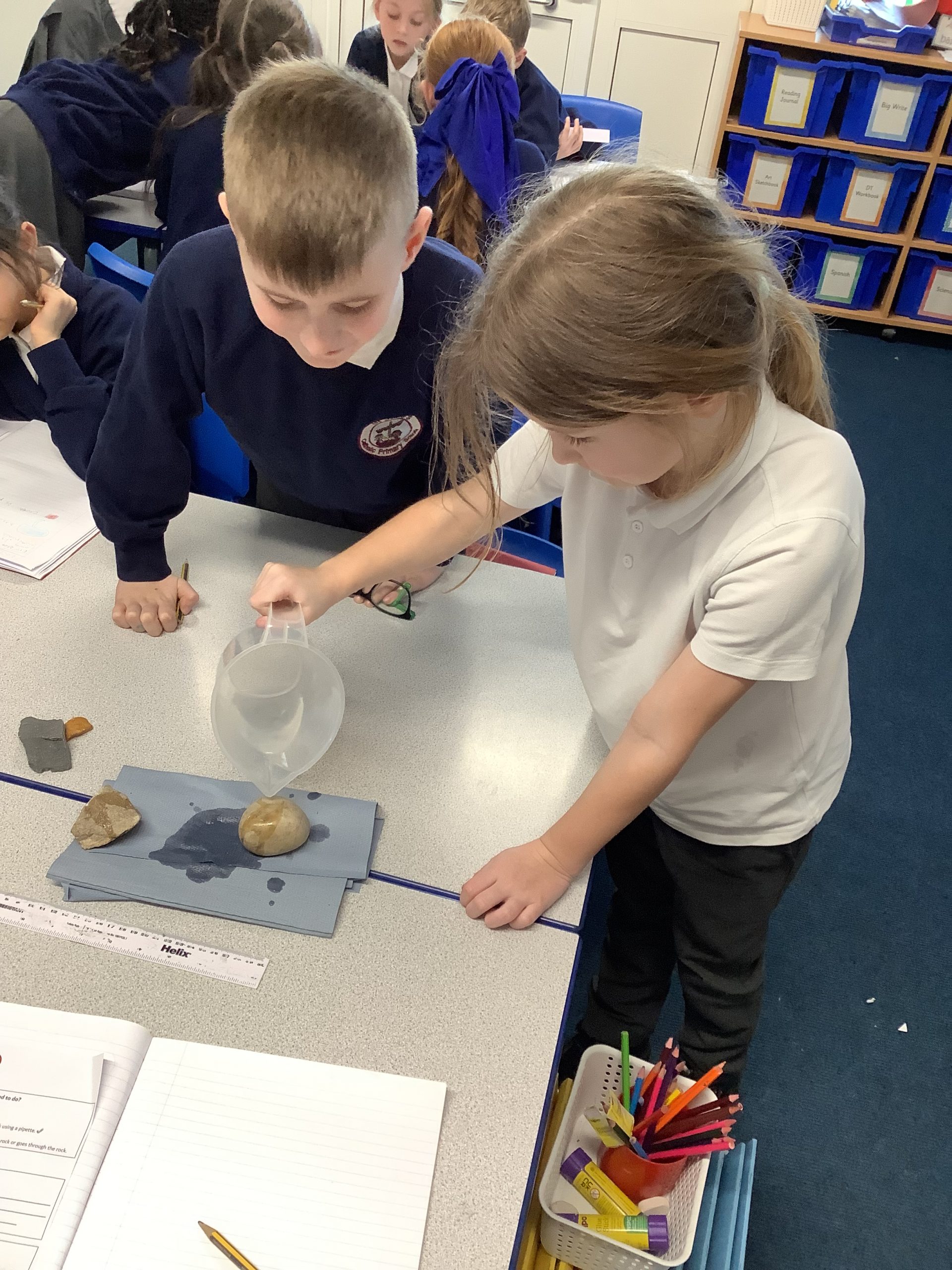 We have been experience with different rocks to find out which ones are permeable. The children tested the rocks by pouring water on them to see which rocks absorbed the water.
