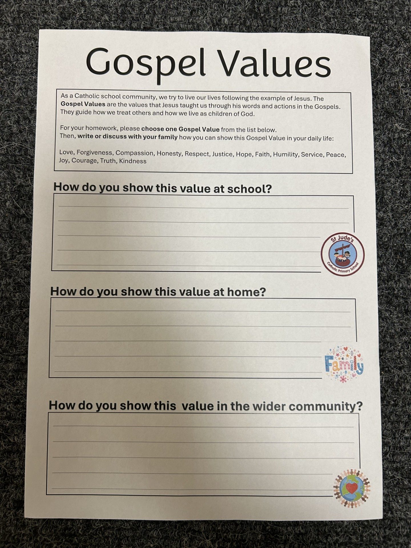 Today your child will have been given homework focusing on the Gospel Values. We hope you can take the time to support your child to choose one and think about how they live it out in their life. We look forward to sharing ideas when they come back after half term.