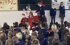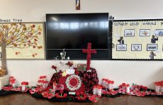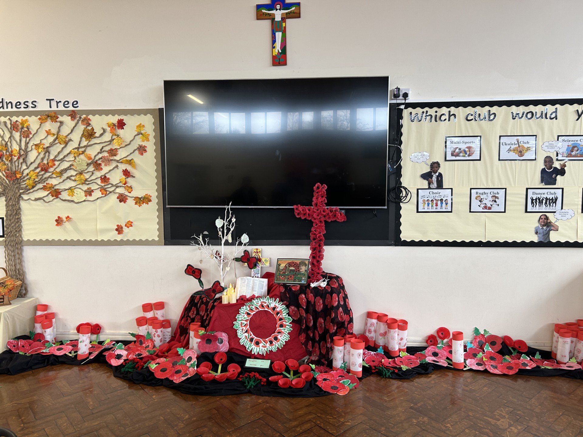 Today we observed a 2 minute silence during a Celebration of the Word to remember all of those who have died in war or been affected by war. Each child made a poppy to create our display.