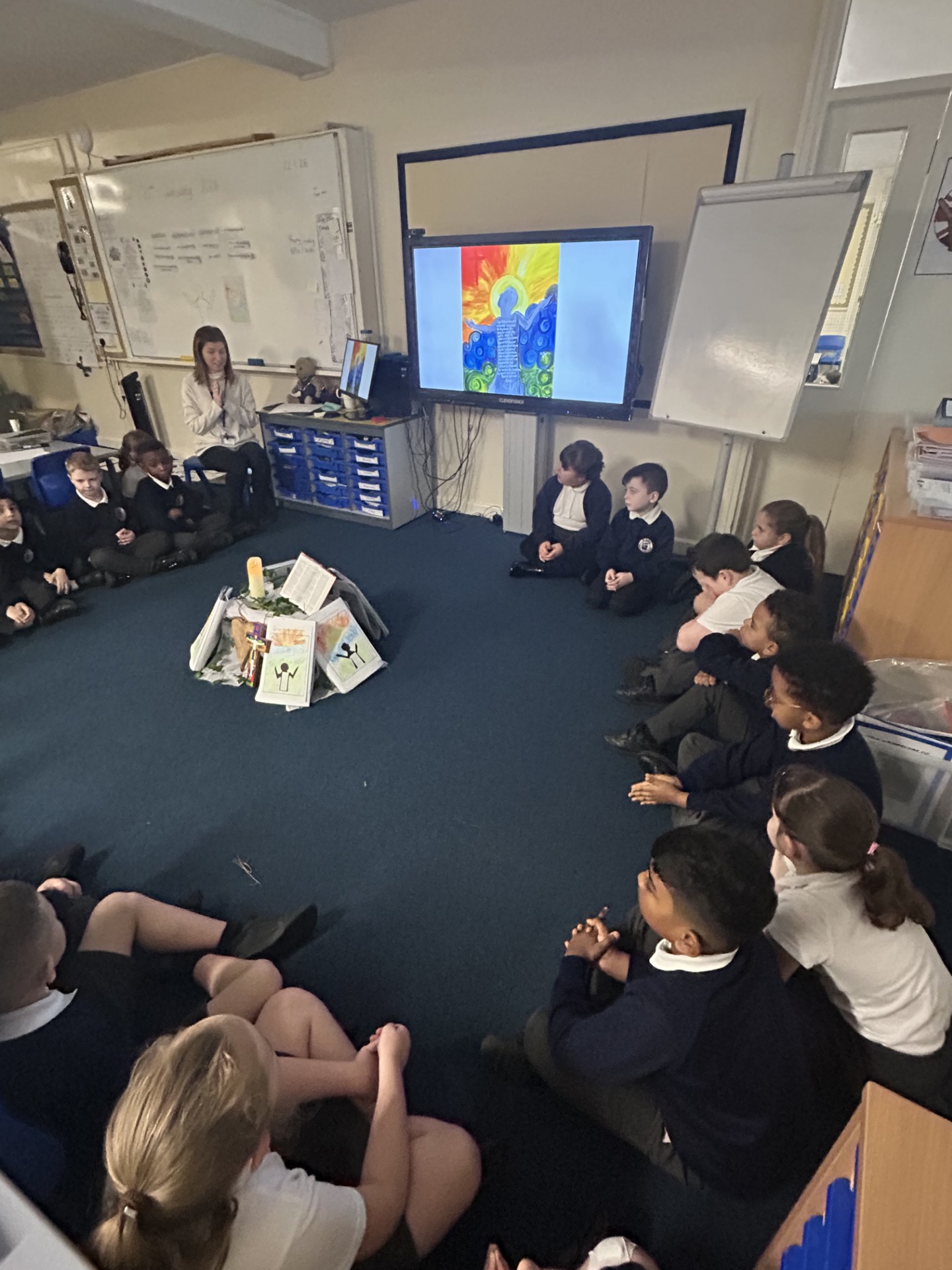 This morning, Year 2, used the artwork they had created based on the ‘Our Father’ as a focus for their Celebration of the Word. They took time to be in silence with God and think about times when they have said sorry and asked for God’s forgiveness. Their artwork will now be shared with other classes to use as a focus point during prayer too.