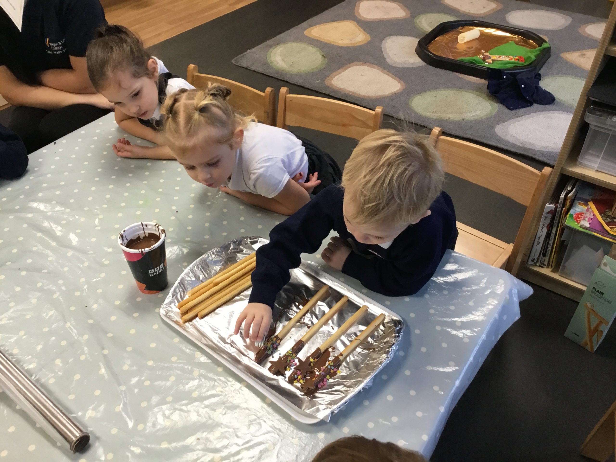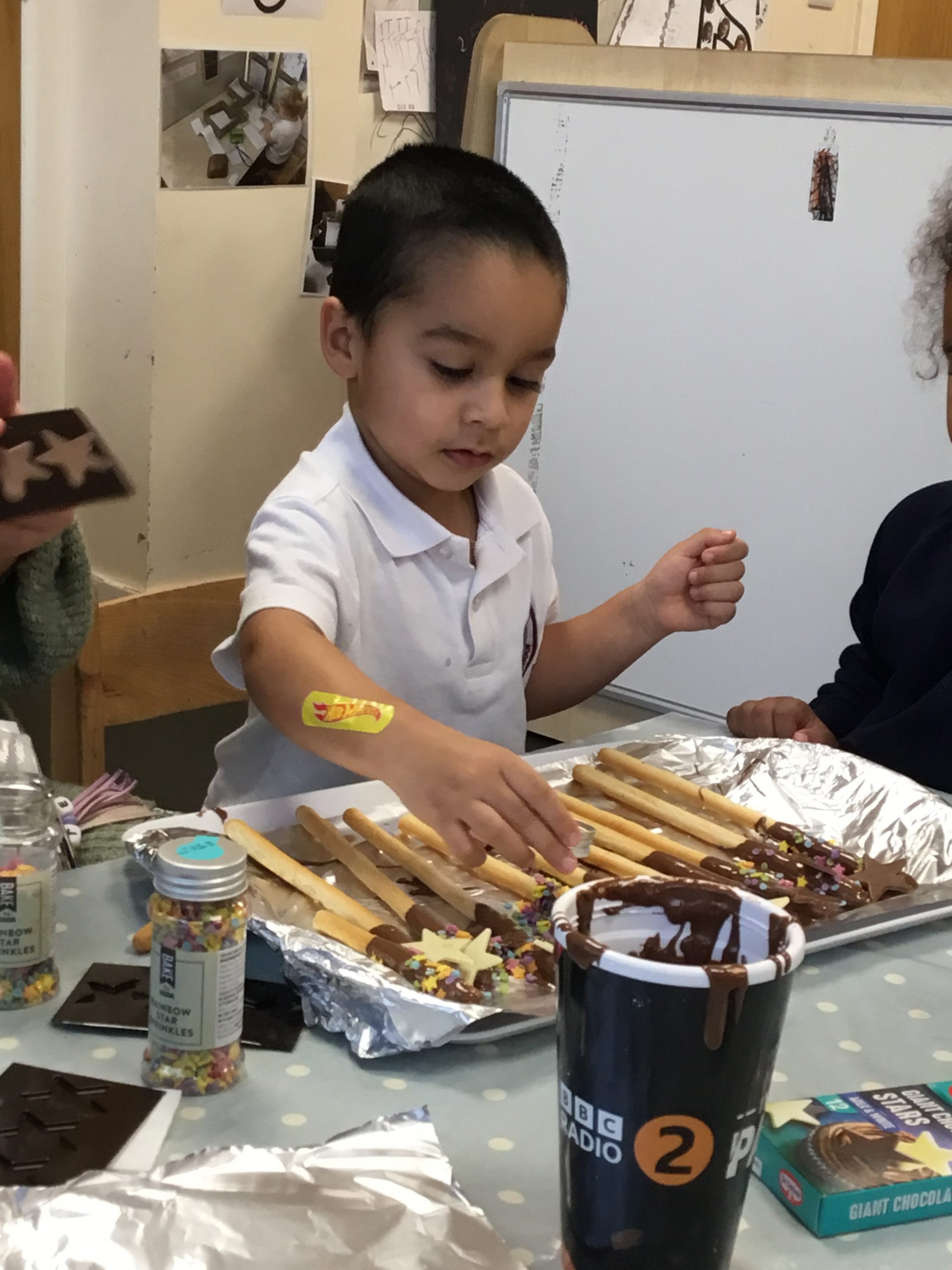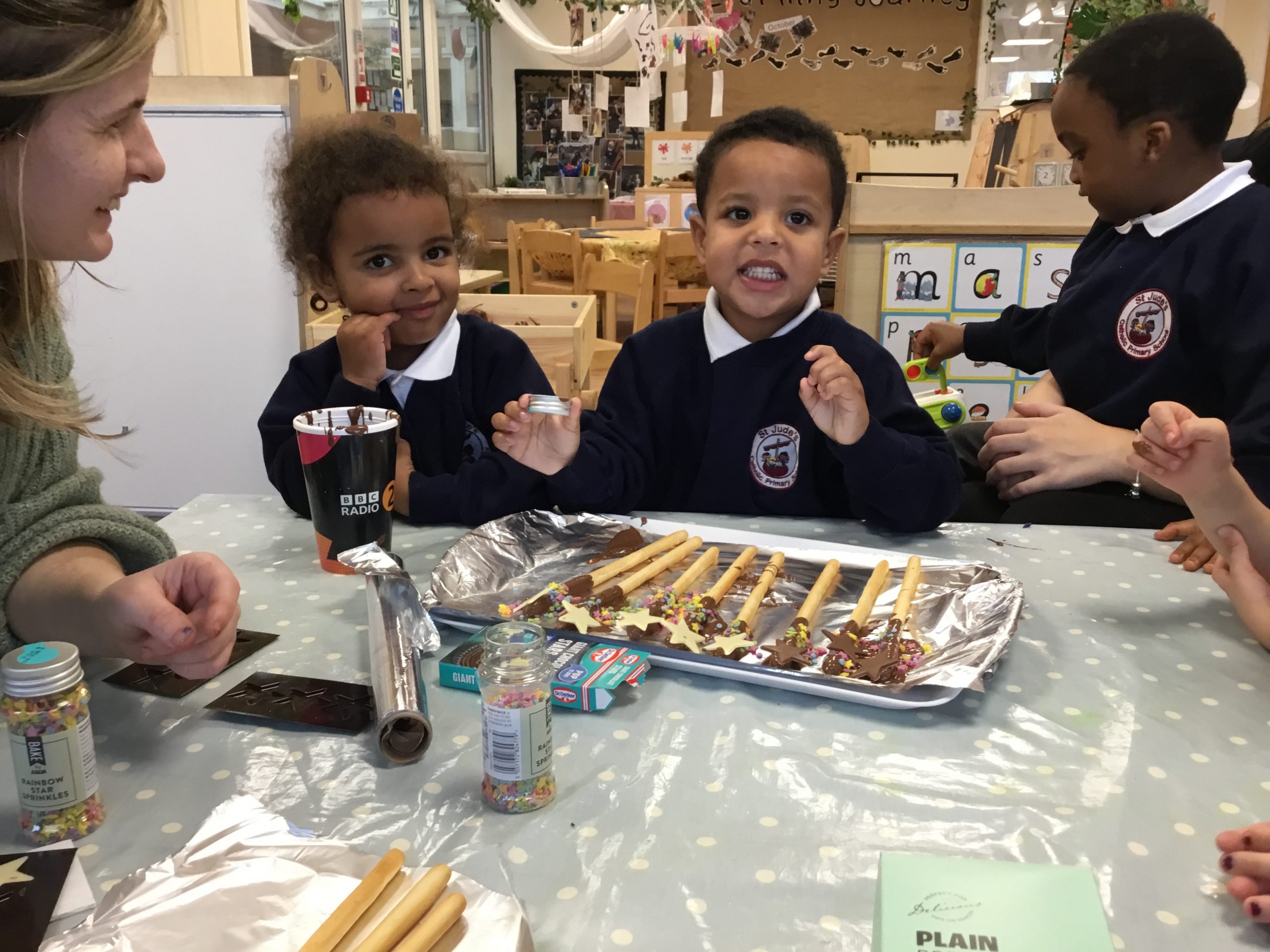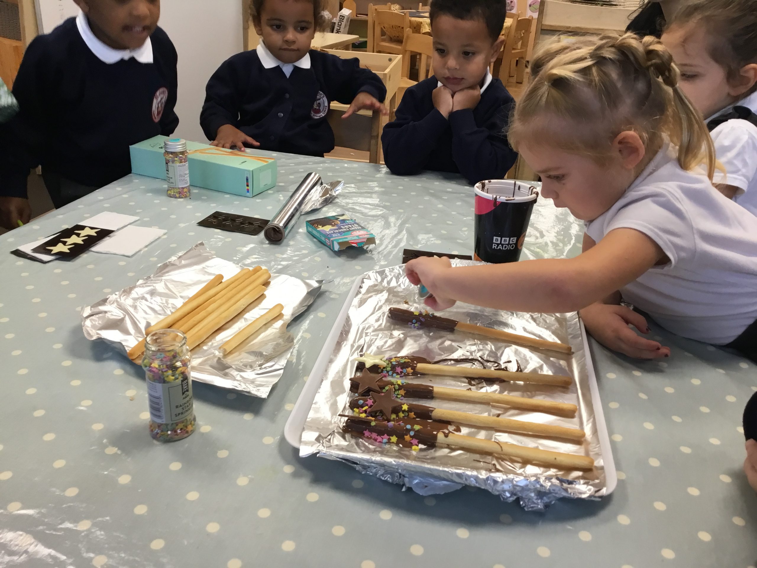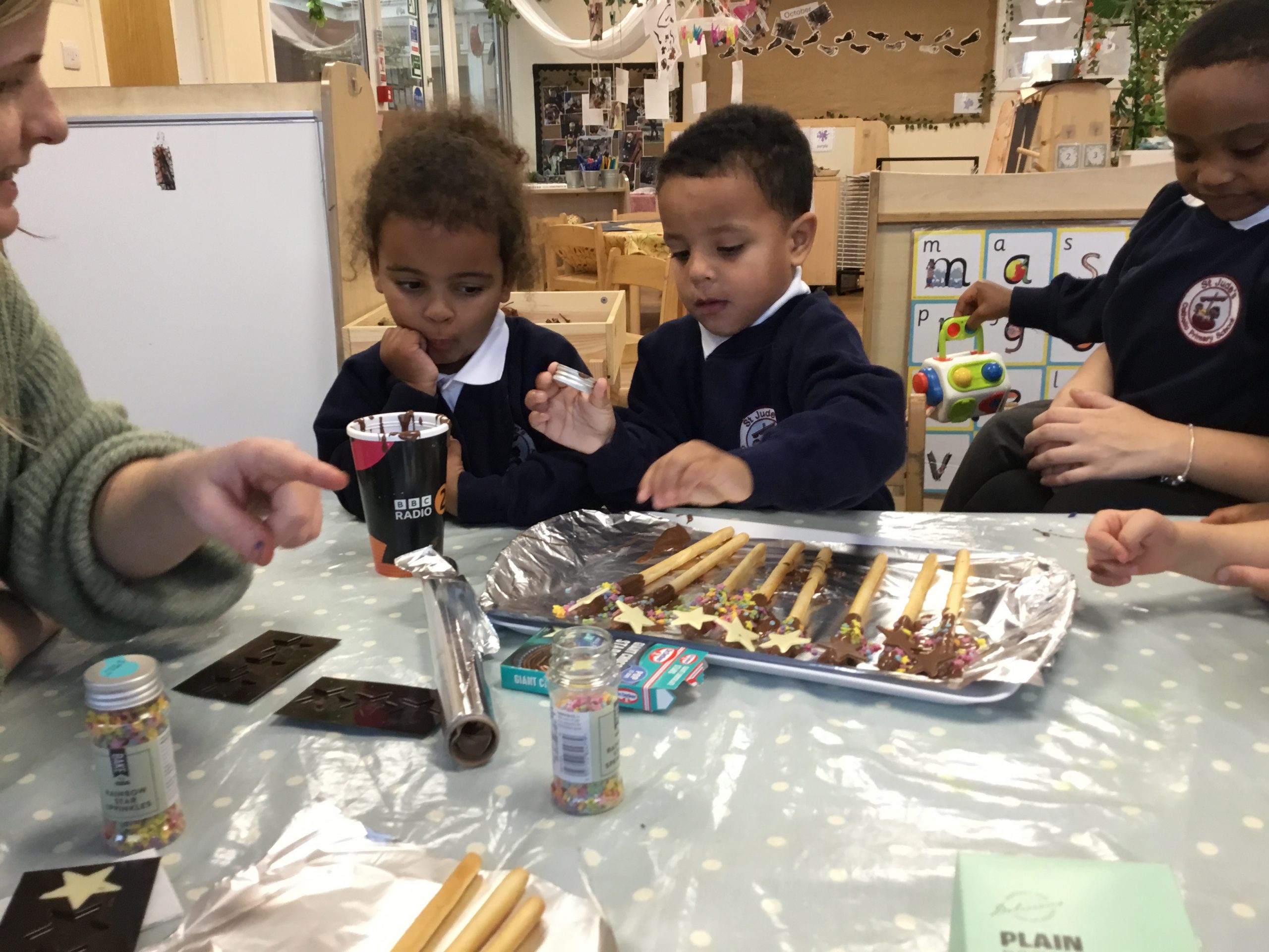 This morning in preschool to celebrate Bonfire Night we have made some chocolate sparkler sticks. We loved to decorate our breadsticks and are so excited to take them home at the end of the day. ❤️🎇